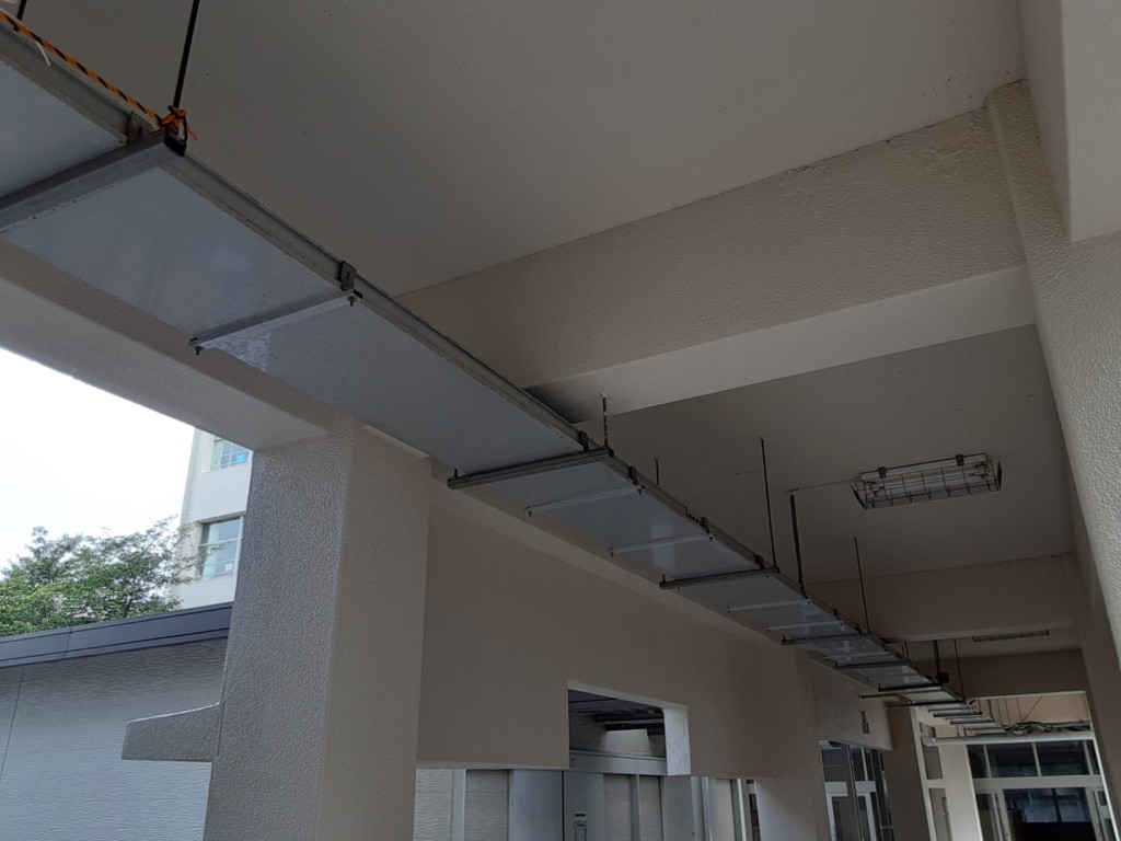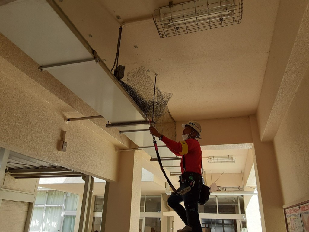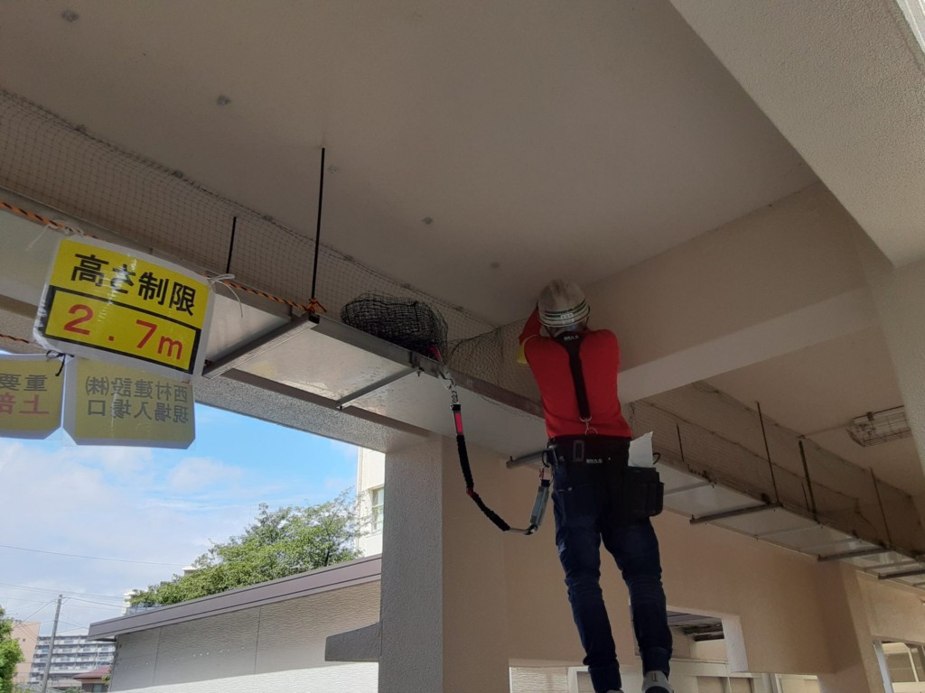 福岡市内の中学校校舎にて防鳥ネット設置工事を行いました。